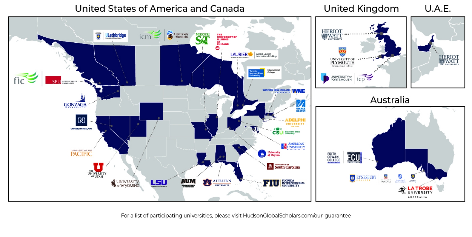 2025年7月現在、パートナーシップ大学はアメリカのみならず、世界中に広がり、40大学とパートナーシップを締結しており、TOEFL/IELTS,SAT/ACT等のテスト得点不問で100%学部入学が保証されます。日本国内の高校の成績評定値は5段階評価で3.5以上、本プログラムの成績評定値は4段階評価で2.5以上が必要となります。